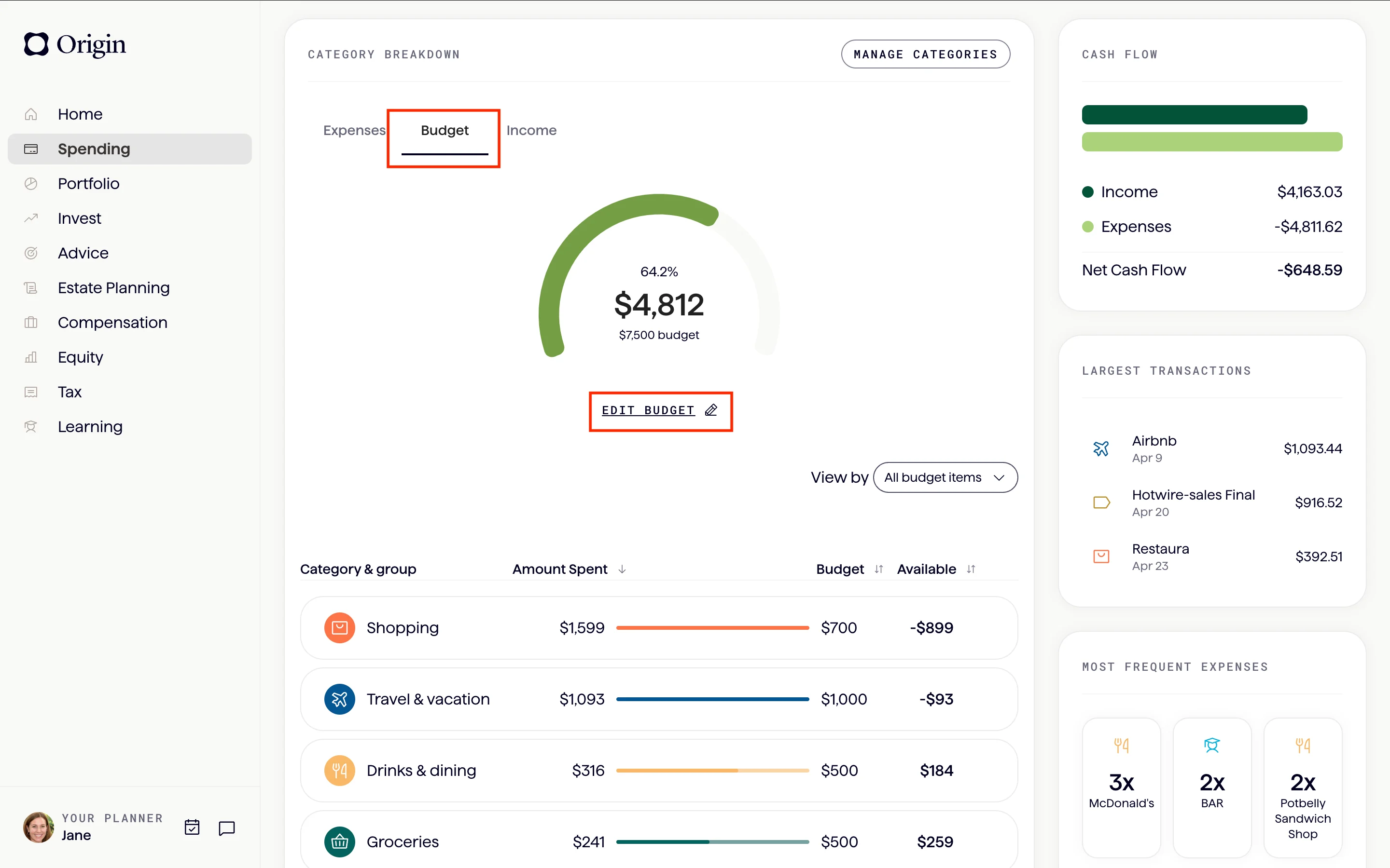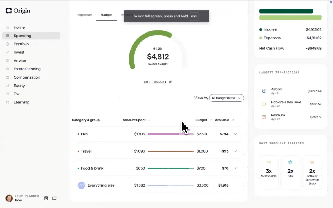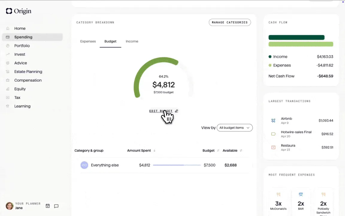 Origin takes the confusion out of budgeting and tracking — and we just added a new feature that allows you to further customize your dashboard: budget groups. With budget groups, you can group your specific budget line items under a broader group umbrella. So, for example, you can slot organize your grocery, restaurant, and meal kit budget items under one larger “food” category.