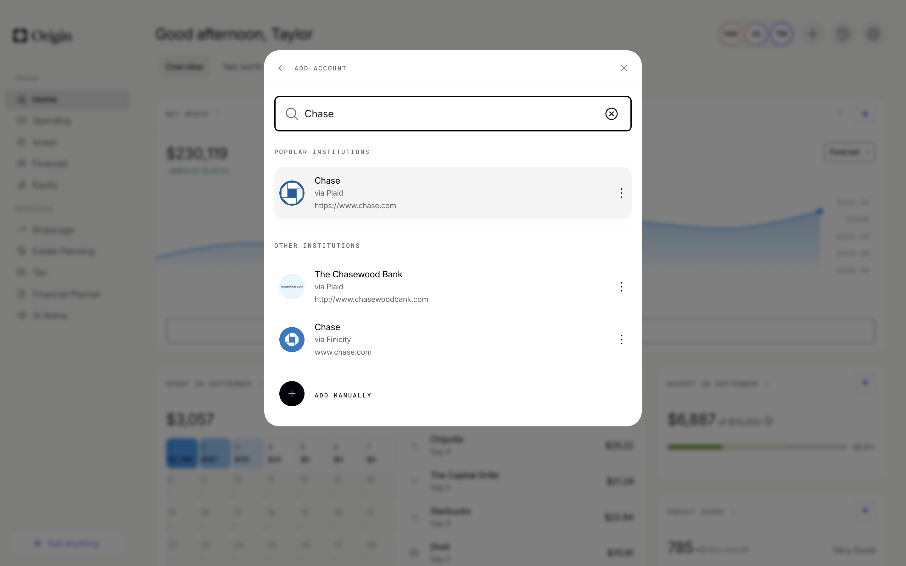 Search for your financial institution(s) in the drop down menu; confirm the owner of the account; then our third-party connector will pull your data into Origin.