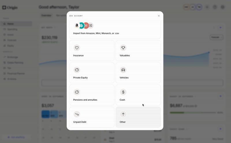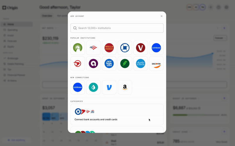 When connecting accounts so that Origin can calculate your net worth, it’s important to include everything that contributes to that, including financial assets outside traditional banks and brokerages — so we offer integrations like Zillow for real estate and Coinbase for cryptocurrency. To add your accounts from those services, you follow the same process.