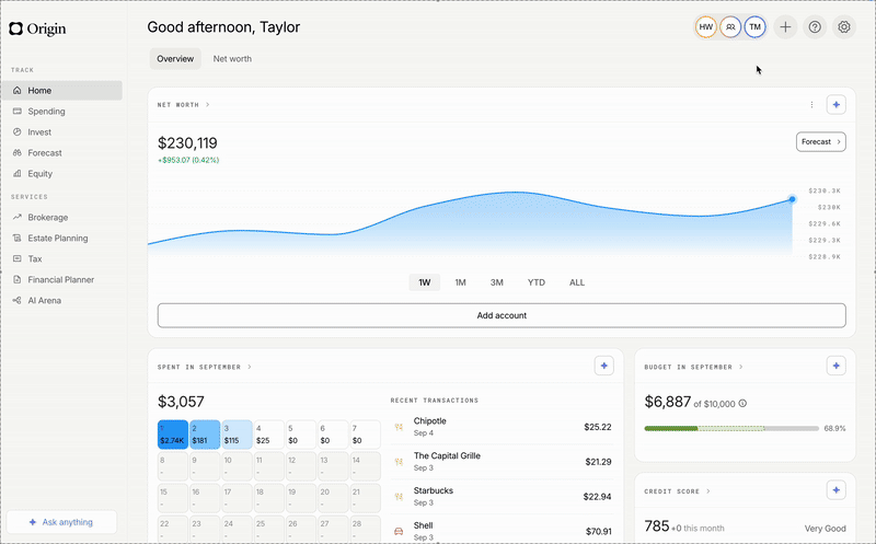 At Origin, we can help you budget, track, and plan for everything from your weekly grocery shopping to your dream retirement home — all while providing you with an easy-to-understand snapshot of your financial picture every time you log on. But to take advantage of those capabilities, your financial accounts need to be securely connected to Origin’s platform. Once you get your banking, investing, and any other accounts set up on Origin, you’ll be able to see your complete net worth (including assets and liabilities), cash flow, and each transaction in real time. The more accounts you connect, the more complete your financial picture on Origin.
