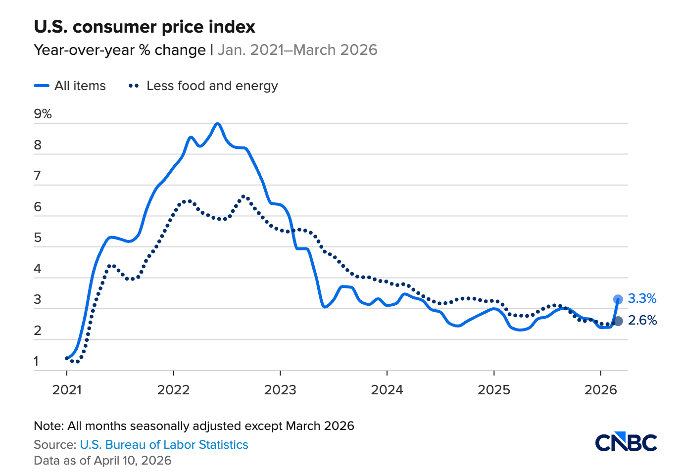 March’s CPI print came out on Friday, and it came in hot at 3.3%. That’s an 0.9% month-over-month leap, and the highest level we’ve seen in two years. We don’t really have to sit around and wonder what caused it, either: Energy prices were up 12.5%, gasoline 18.9%, and fuel oil up 44.2% year-over-year from last March, a drastic acceleration from what we saw in February, pre-Iran conflict. Core inflation, which excludes volatile categories like food and energy, came in at 2.6% — that’s an uptick of just 0.1% from last month and under the 2.7% forecast — compared to the 0.9% leap that headline inflation took.