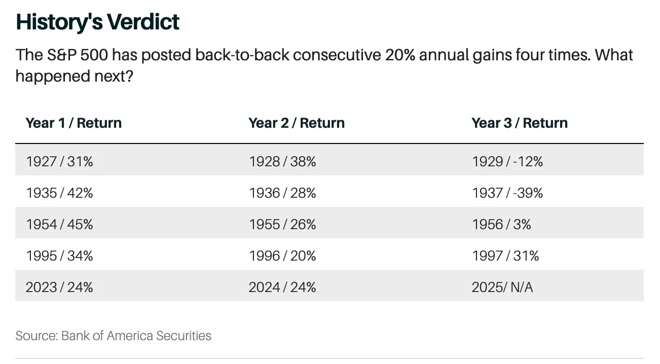 Save for the brief correction that markets experienced in 2022, investors have enjoyed nothing short of market euphoria over the last few years. Between the pandemic flash crash in March 2020 and its all-time high in February 2025, the S&P 500 posted cumulative gains of 141% — that’s an average annual return of 28.2%, an unprecedented pace, and localized gains in sectors like AI and tech have far exceeded even that. So observers knew going into this year that markets would likely cool off a bit: Before 2024, the S&P 500 had only put up back-to-back years of 20%+ returns four times in history. A bear market followed in two cases; a meager 3% gain followed the third; and a continued rally had happened only once, in 1997.