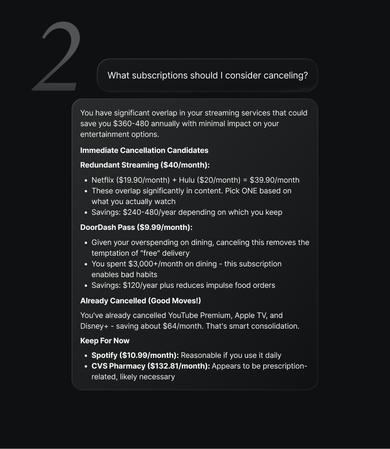 Since Origin is connected to all your accounts, you can ask specific questions about trends or habits you’re curious about. Diving deep into your spending patterns, Advisor can deliver customized insights to keep you on top of your goals, reveal areas to cut back on, or tell you when you have some extra breathing room. Here are some examples of questions that AI Advisor can answer regarding your spending.