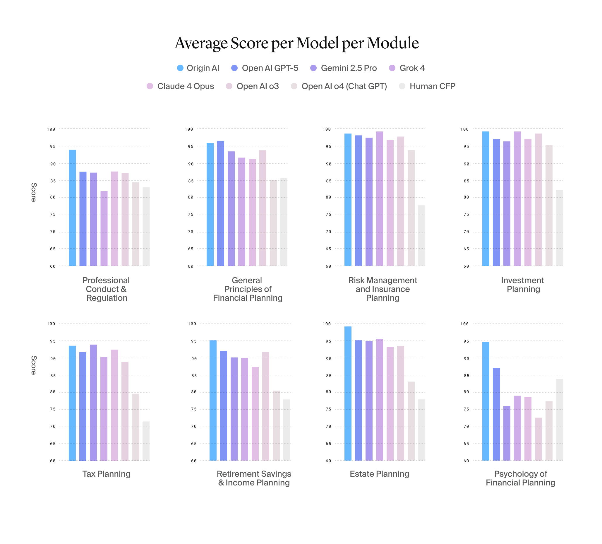 Origin has built the first AI financial advisor designed for contextual reasoning, combining a multi-agent architecture with leading LLMs (Claude 4.1 Opus, OpenAI GPT, Gemini 2.5 Flash, and Perplexity Sonar Pro) to deliver advisor-grade answers. Each query is routed to specialized agents and enriched with real-time market data and the user’s financial history, so responses are personalized, current, and context-aware. A compliance system vets every output against 100+ fiduciary, privacy, and accuracy standards. The result is the first AI platform capable of operating safely at scale in regulated financial domains — producing advisor-grade responses that outperform both humans and frontier LLMs on financial reasoning tasks.