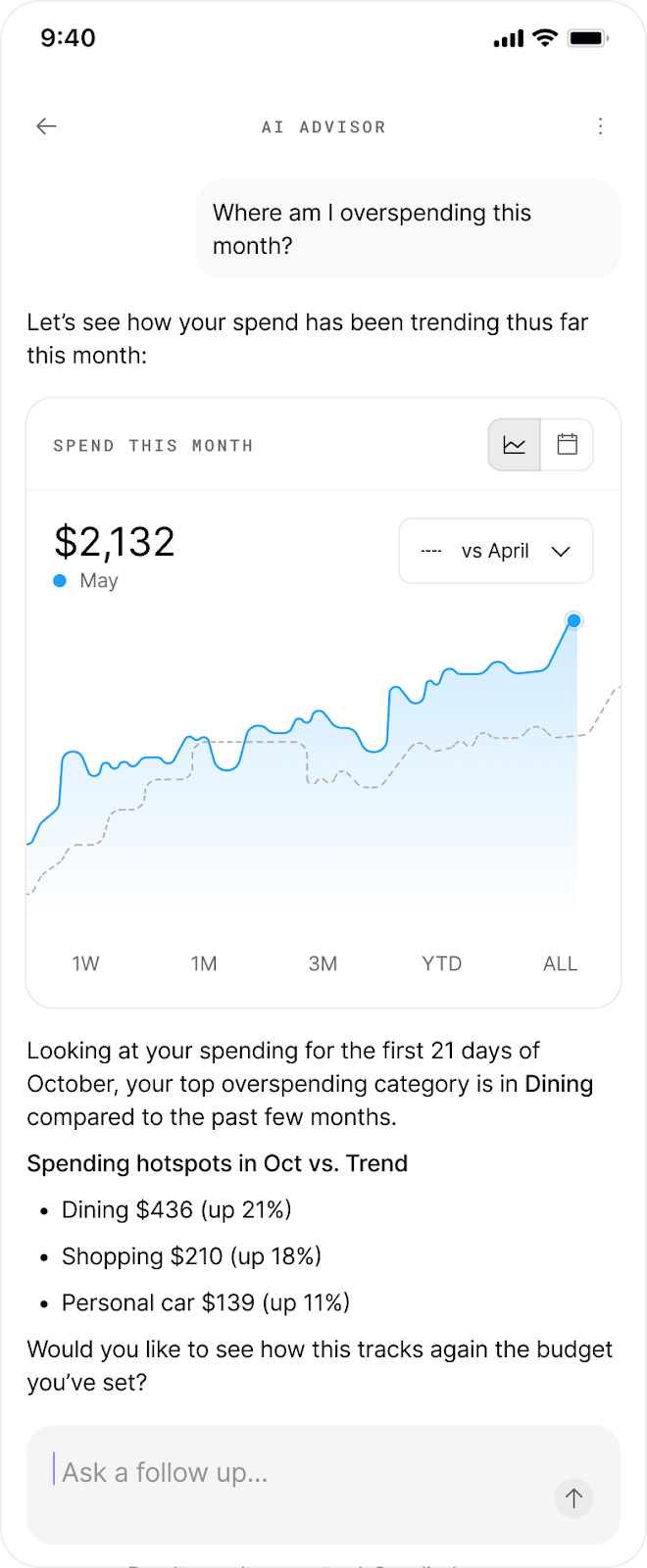 Spending analysis begins with a simple query like “Where am I overspending this month?” Instead of just surfacing a transaction list, the system parses intent, resolves the relevant timeframe, and pulls categorized data from linked accounts. Persistent memory ensures prior user corrections—like reclassifying Pilates as fitness—are applied automatically, keeping the data set clean. From there, it runs anomaly detection against the user’s historical baseline and peer spending patterns, isolating categories that deviate significantly. The explanation surfaces as plain language: dining spend is 42% higher than usual, or rideshare costs have increased due to higher trip frequency. In practice, this workflow turns a vague concern about “overspending” into a targeted, data-driven insight.