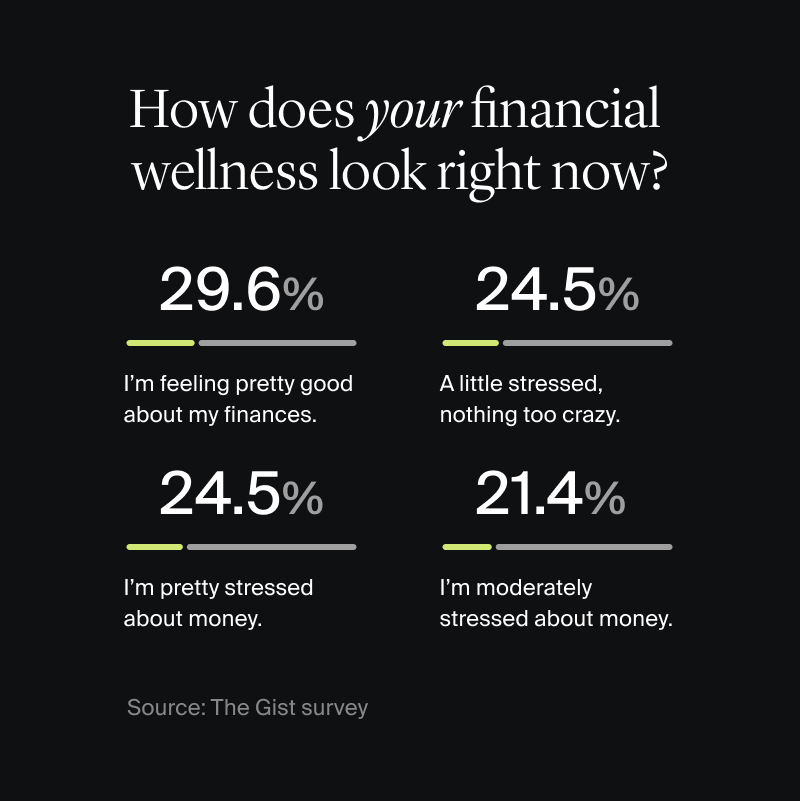Last week, Origin ran a quick poll in The Gist to get a temperature check on how people are feeling about their money right now. Out of 98 responses, the results were basically split down the middle. About a quarter said they’re highly stressed about money, another quarter said they’re moderately stressed, another quarter felt only slightly stressed, and just under a third said they’re feeling good. In other words: no single mood is carrying the room—money stress and money confidence are running neck and neck.