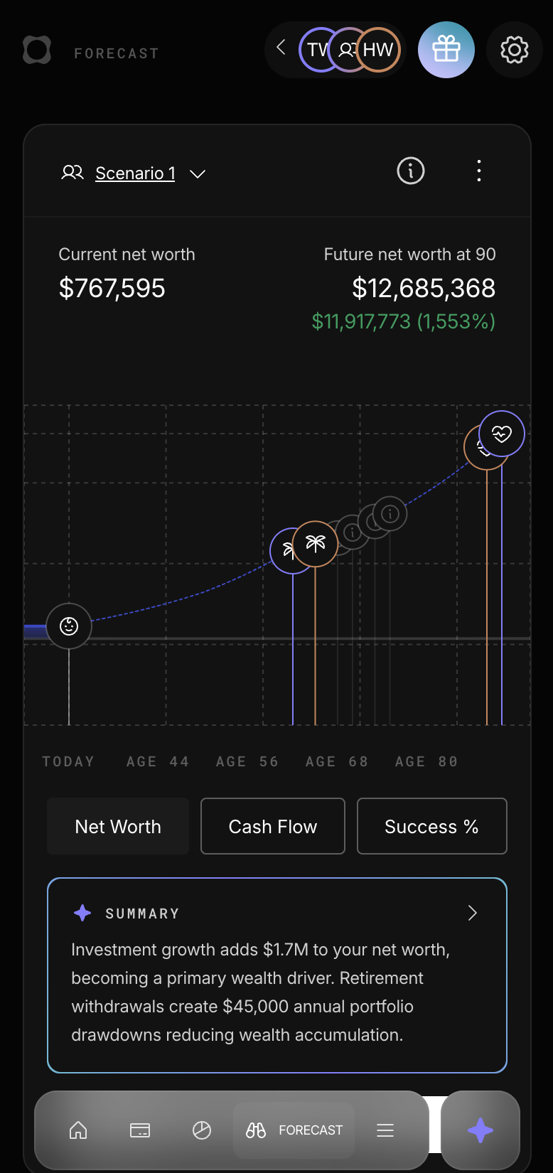 AI-Powered Forecasting with Milestones: Add goals like buying a home or planning a wedding, and Origin’s Forecasting feature can project future cash flow, net worth, and investment growth based on real accounts, income, taxes, and assumptions. Couples can create multiple scenarios to test different timelines or priorities—such as adjusting savings rates or goal order—and see how each version affects the others before committing.